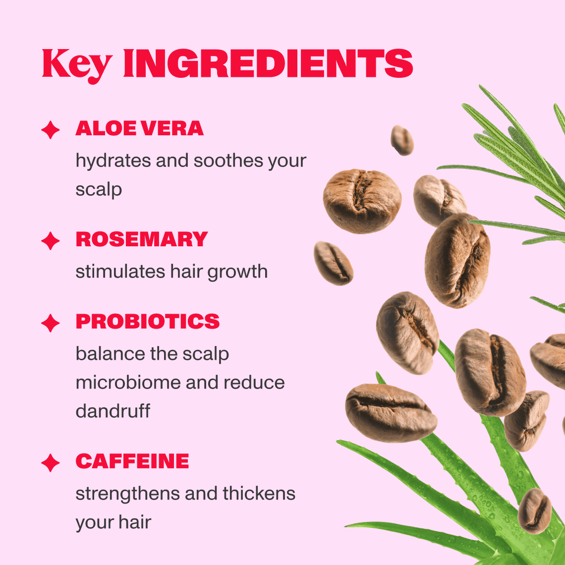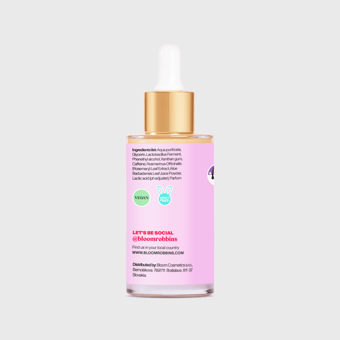 Aqua purificata, Glycerin, Lactobacillus Ferment, Phenethyl alcohol, Xanthan gum, Caffeine, Rosmarinus Officinalis (Rosemary) Leaf Extract, Aloe Barbadensis Leaf Juice Powder, Lactic acid (pH adjuster), Perfume