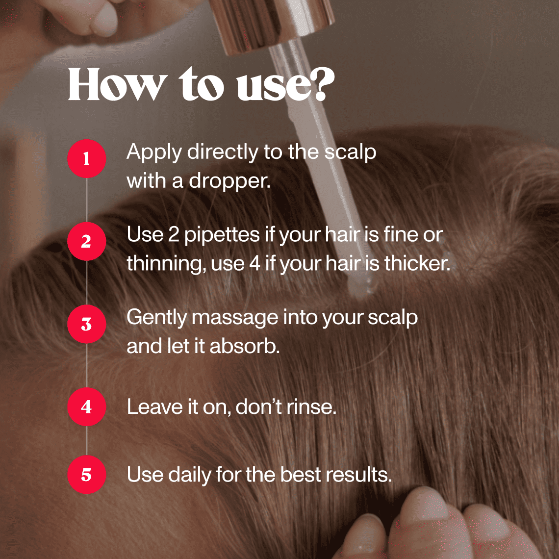 Take the hair serum using a dropper and evenly distribute it on the scalp. The amount of the hair serum depends on your hair type. Ideally, use 2 droppers for fine hair and 4 droppers for thick hair. Rub it into the scalp using a circular motion. The product is lightweight and non-greasy, making it suitable for daily use. You don't need to rinse the serum after the application.