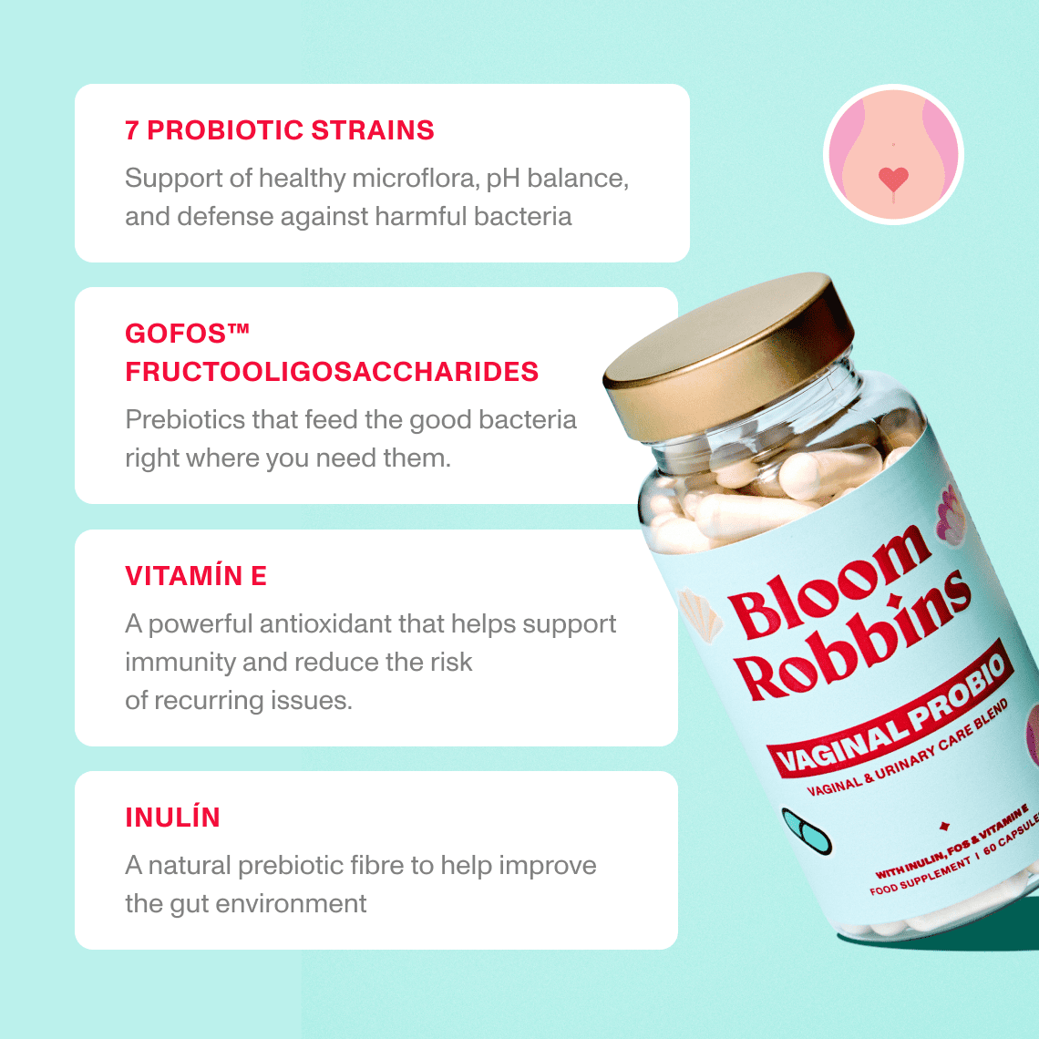 Probiotics attach to the cells of the vaginal lining and produce lactic acid, which keeps the pH naturally low. This creates an environment that discourages the growth of harmful bacteria and yeast. Prebiotics act as food for the good bacteria, while vitamin E helps protect cells from oxidative stress.