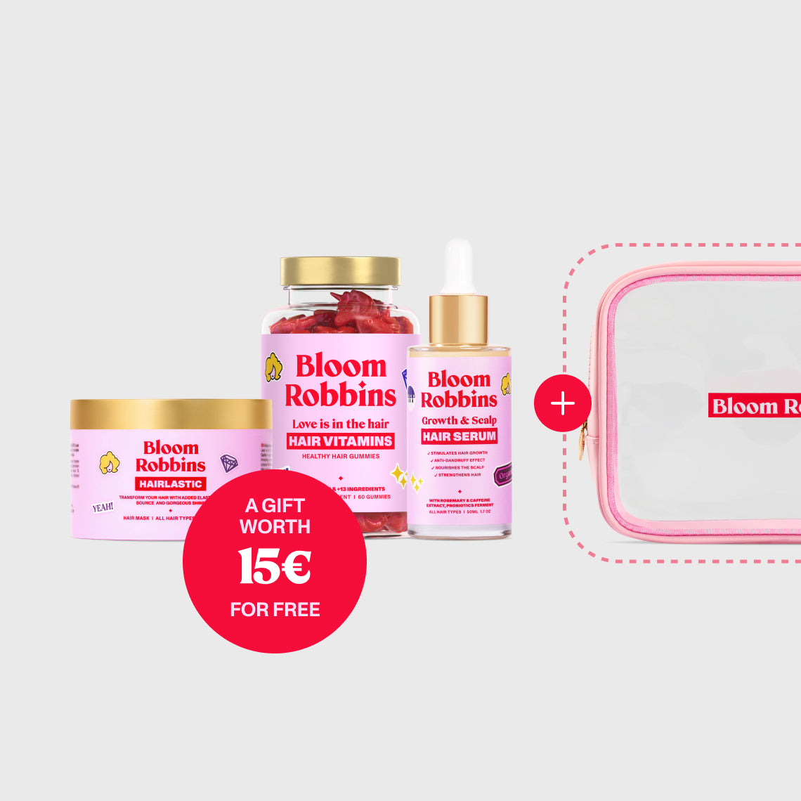 A trio every woman needs! Our vitamins, whether in the form of delicious gummies or practical capsules, are the key to achieving healthy, beautiful, and thick hair. They support hair growth and reduce hair loss, while giving your body all the necessary nutrients. A healthy scalp is essential for beautiful hair, so our Growth & Scalp Hair Serum is a must-have. With its natural formula featuring rosemary, caffeine, aloe vera, and probiotics, it’s designed to nourish your hair from the roots. To make sure your hair styling doesn't take hours, our Hairlastic Mask does the work for you. Enriched with hydrolysed elastin, castor oil, coconut oil and argan oil, this hair mask tames unruly and frizzy hair. As a little bonus, you’ll also receive a stylish cosmetic bag—perfect for keeping your hair-care trio together.